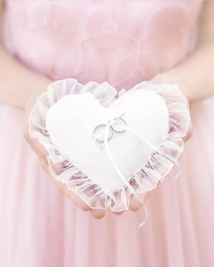 Biely vankúšik na obrúčky s čipkou v tvare srdca