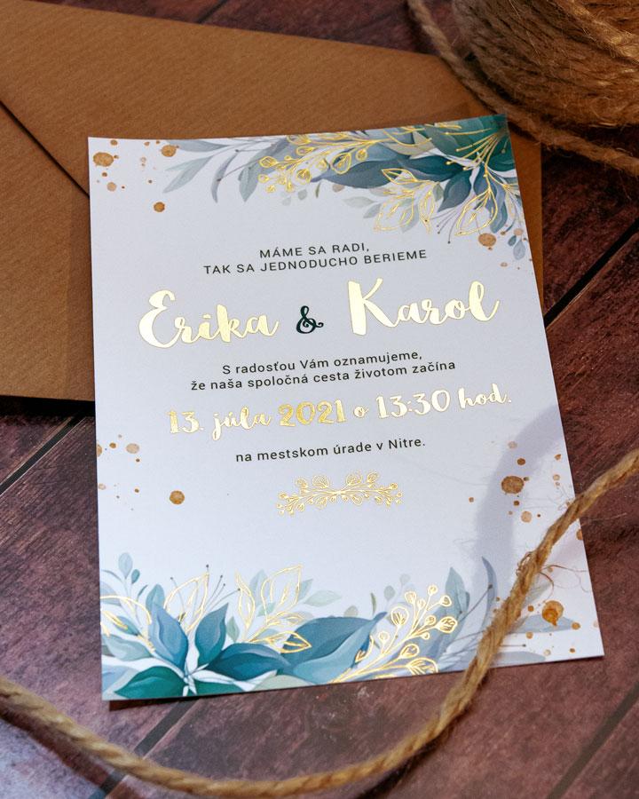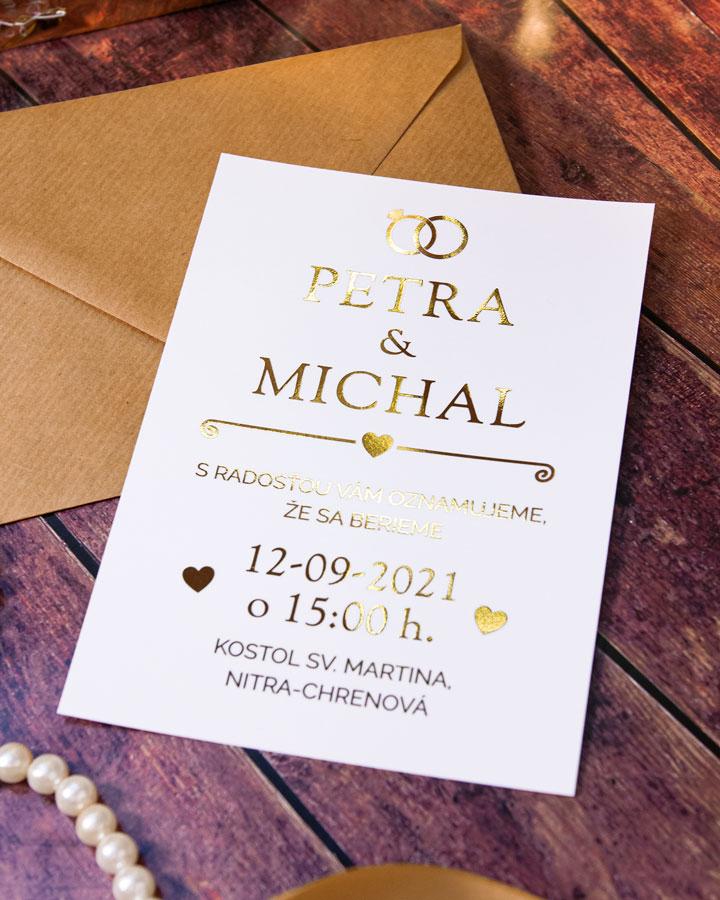 Metalické svadobné oznámenia sú synonymom luxusu a elegancie, ideálne pre páry, ktoré túžia po jedinečnom a nezabudnuteľnom oznámení svojho veľkého dňa. Vďaka špeciálnej metalickej potlači na extra hrubom matnom 350g papieri dosahuje metalické prvky vysoký lesk a sofistikovaný vzhľad, ktorý zaujme na prvý pohľad. Ponúkame širokú paletu dizajnov, od klasických motívov až po moderné minimalistické vzory, aby sme vyhoveli rôznym vkusom a predstavám. Naše oznámenia sú nielen vizuálne pôsobivé, ale aj cenovo dostupné a dodávané v krátkom čase, čo zaručuje spokojnosť našich zákazníkov.
