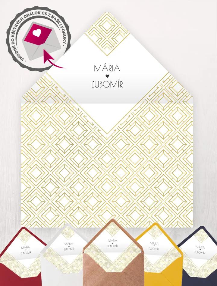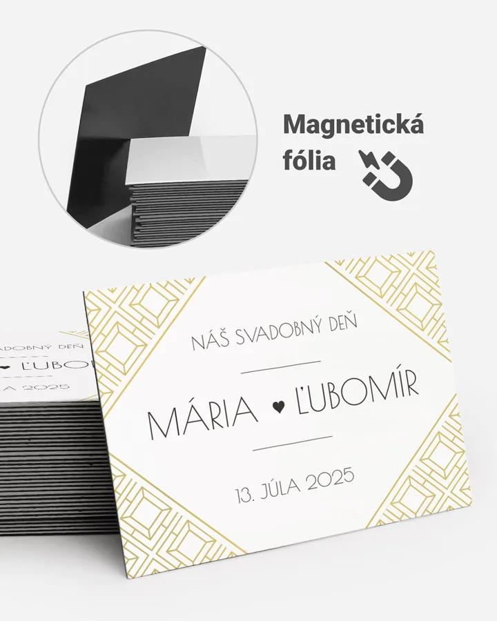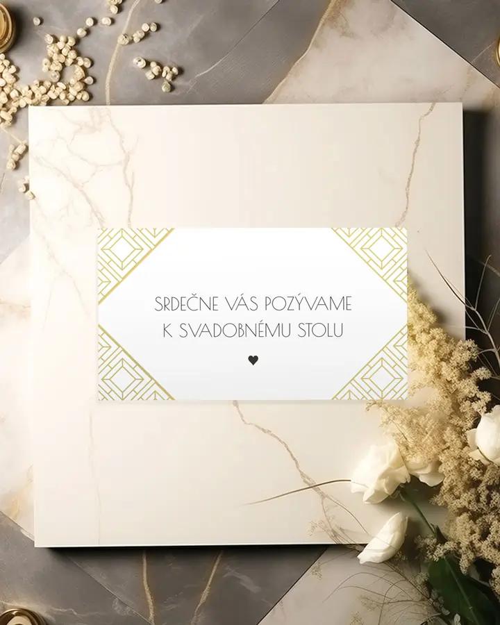 Luxusný motív zdobený geometrickým vzorom v tvare diamantu upúta hneď na prvý pohľad svojou eleganciou. Svadobné oznámenia budú pekne ladiť s výzdobou v zlatej a bielej farbe. Vybrať si k nim môžete tiež pozvánky k stolu, menovky, etikety na fľaše a ďalšie svadobné tlačoviny. Potrebujete mať všetko pripravené v čo najkratšom čase? Spoľahnúť sa môžete na expresnú výrobu a kvalitnú tlač.