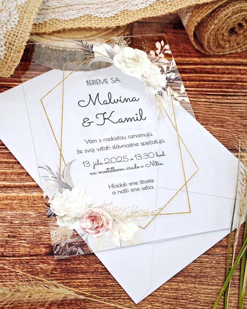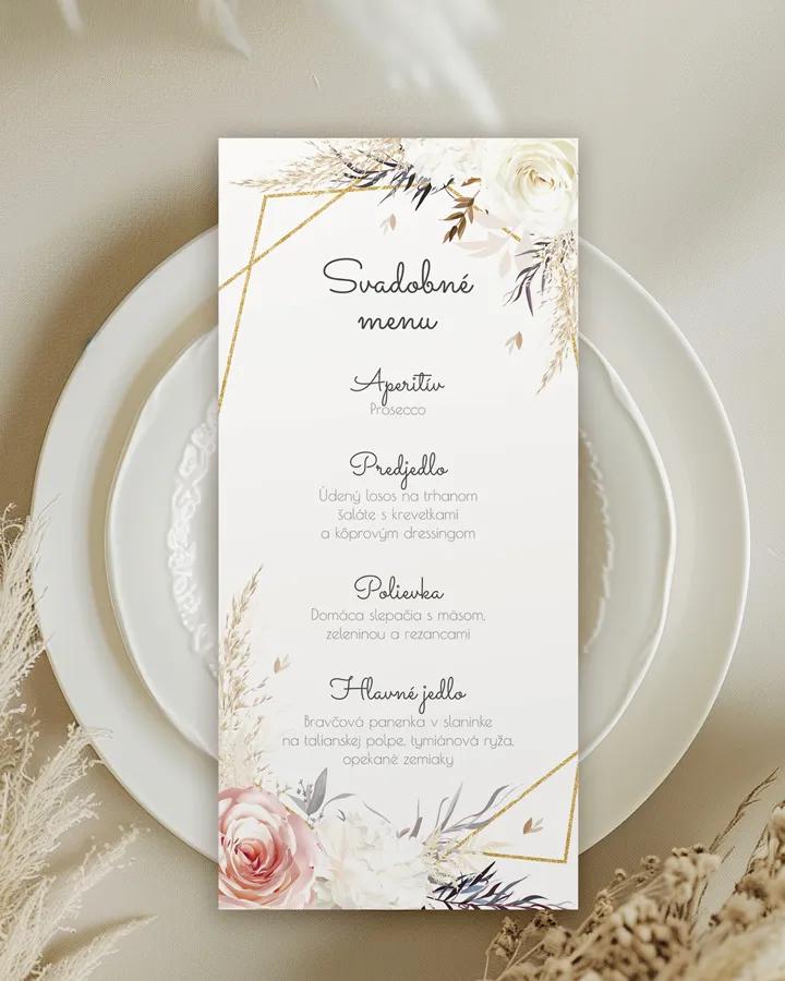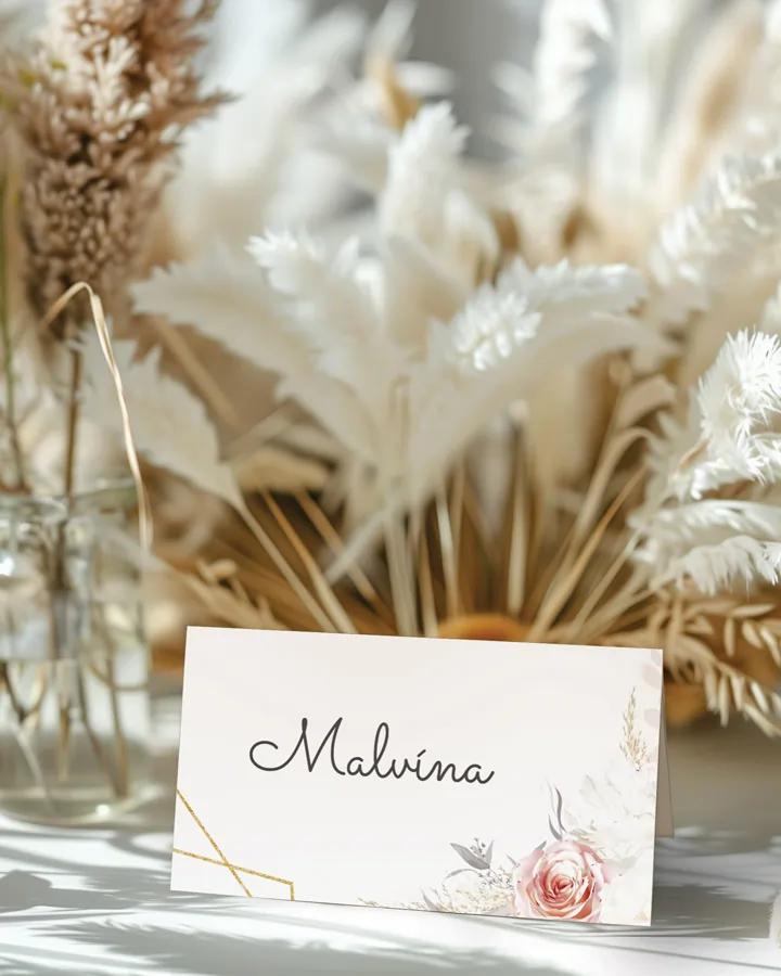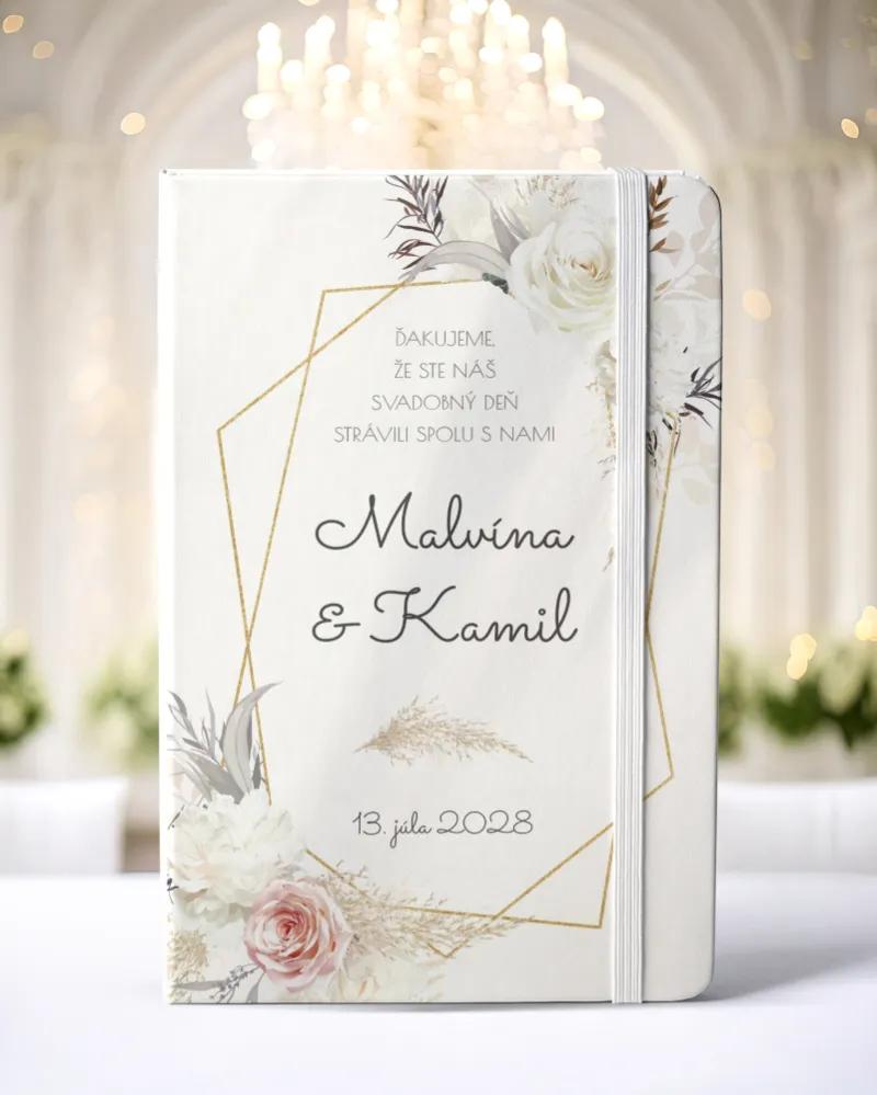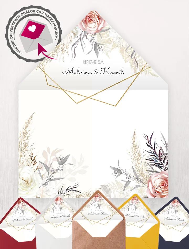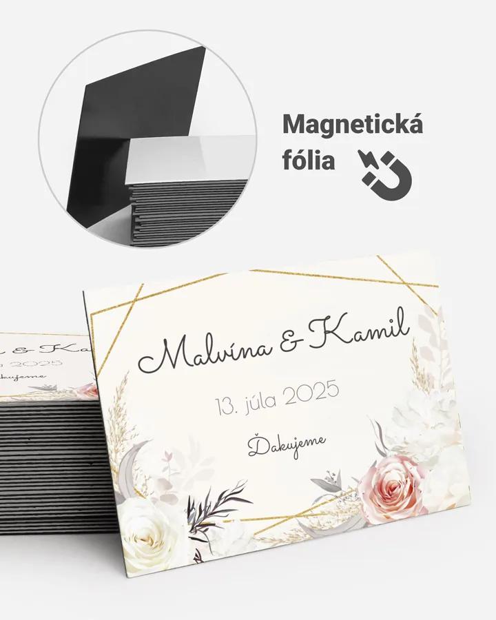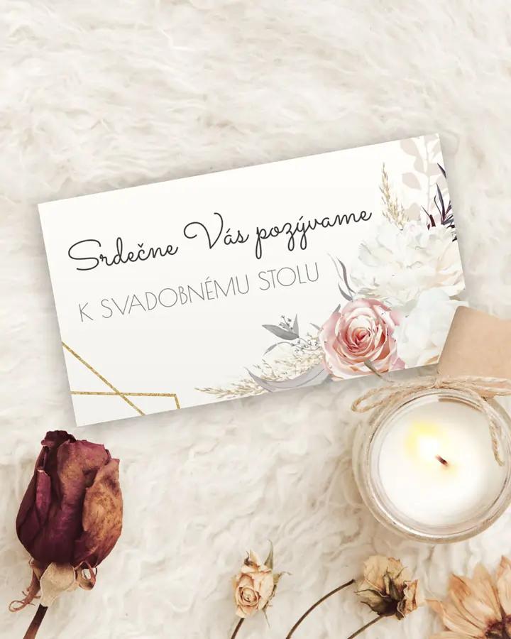 Svadobné oznámenia — Rozkvitnuté kvety pôsobia na prvý pohľad veľmi slávnostne, pričom zároveň dýchajú krásou romantiky. Doplnené o ozdobný rámik netradičného tvaru zaujímavým spôsobom zvýrazňujú mená snúbencov. Zapáčili sa vám? V tomto motíve pre vás radi pripravíme všetky svadobné tlačoviny. Pozvánky k stolu, menovky, etikety na fľaše, samolepky na výslužky aj magnetky pre hostí tak budú krásne zladené.