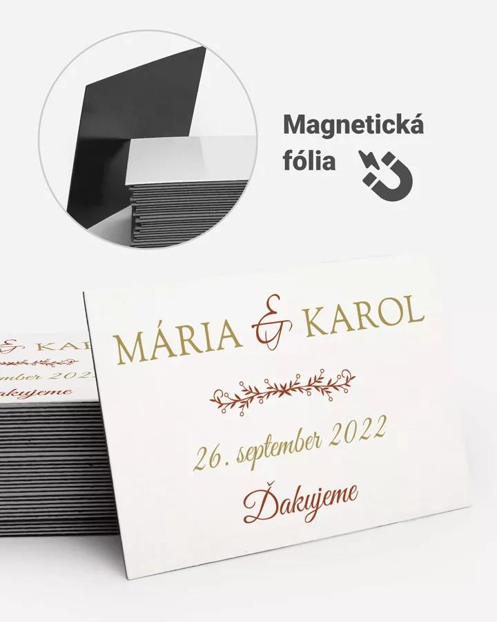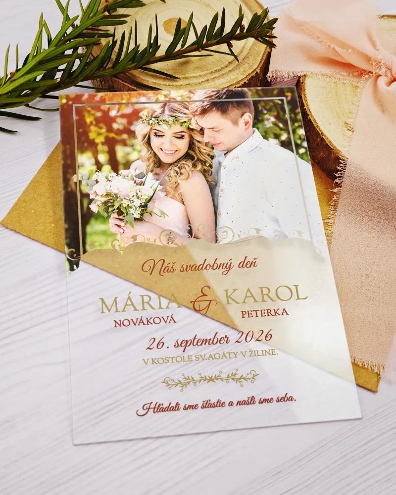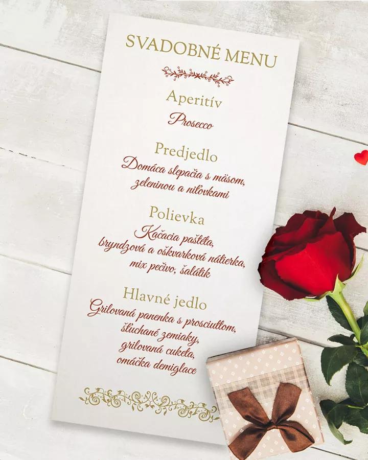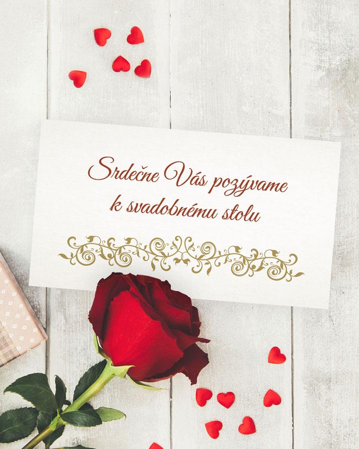 Svadba je intímnou a osobnou udalosťou vo Vašom živote, preto aj pozvanie hostí na ňu by malo byť špeciálne. Preto Vám prinášame svadobné oznámenie s bielym pozadím, červeno-zlatým písmom a najmä Vašou fotkou, ktorá hrá na oznámení hlavnú úlohu. V rovnakom motíve Vám vieme ponúknuť i menovky či etikety na fľaše, aby bolo všetko zladené.