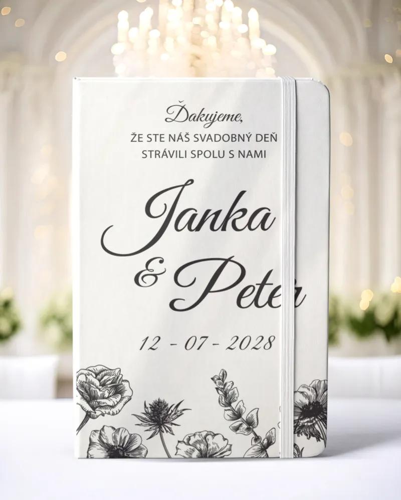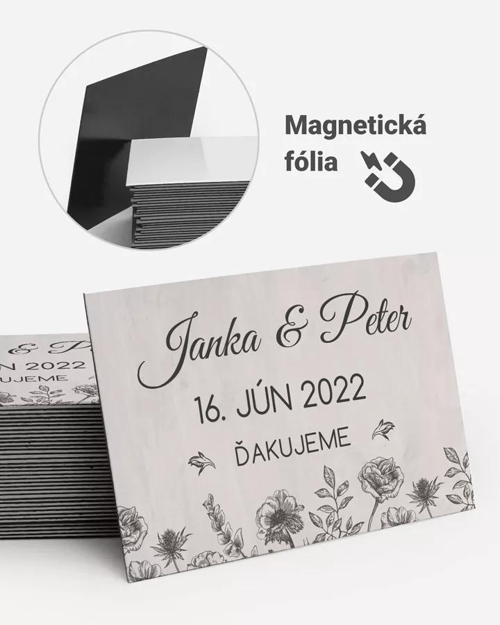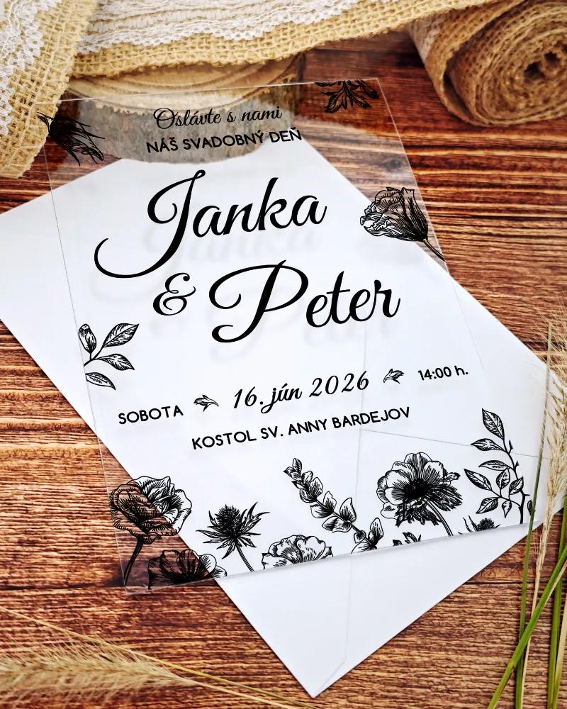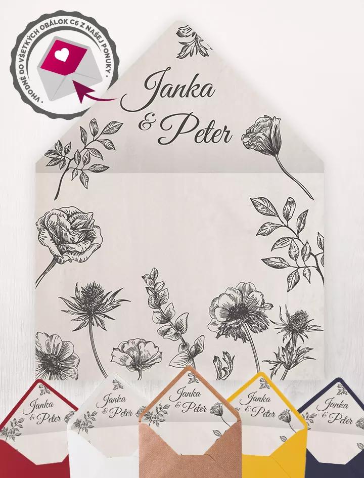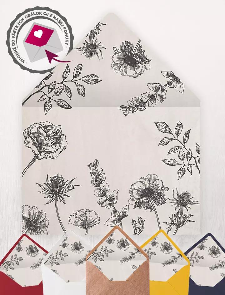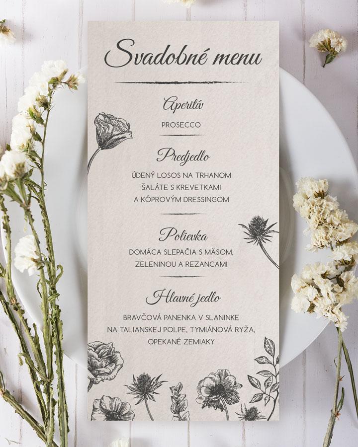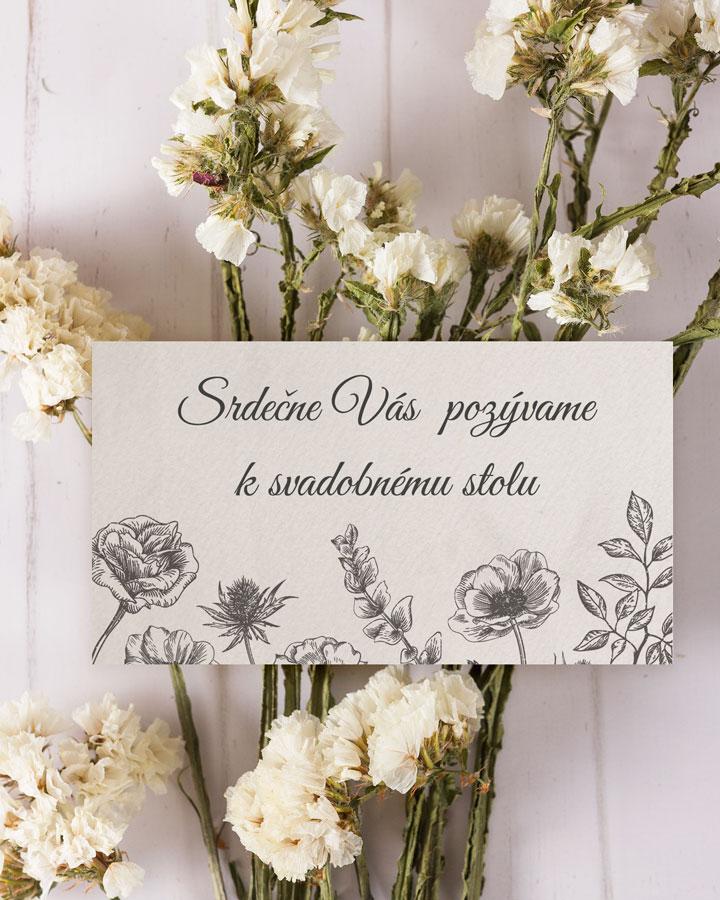 Sú farbami Vašej svadby čierna a biela, ale stále chcete i tradičné zdobenie pomocou kvetov? Toto svadobné oznámenie bude presne to, čo hľadáte. Bledé pozadie, čierne písmo oznámenia a čiernou farbou tvorené poľné kvety vytvárajú krásny celok. V rovnakom motíve Vám vieme dokonca vytvoriť i menovky, magnetky, či etikety na fľaše, aby bolo všetko zladené.