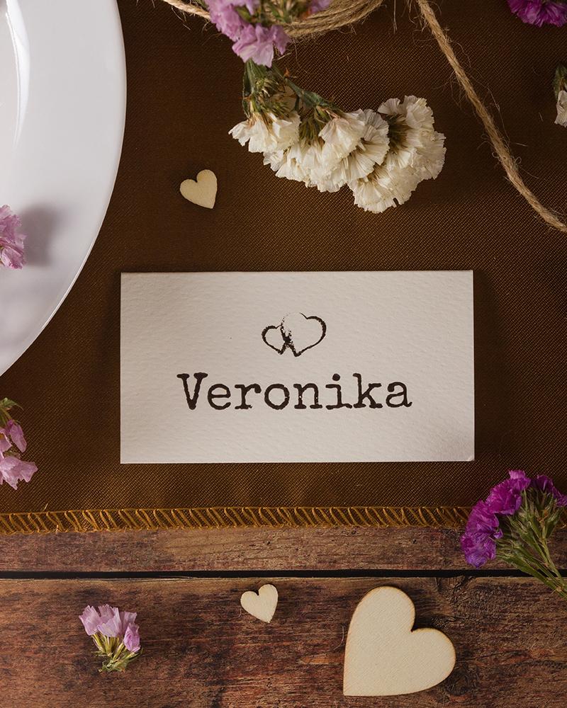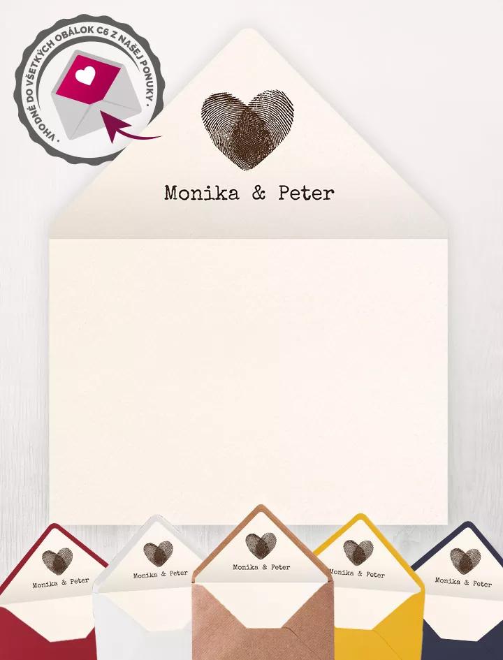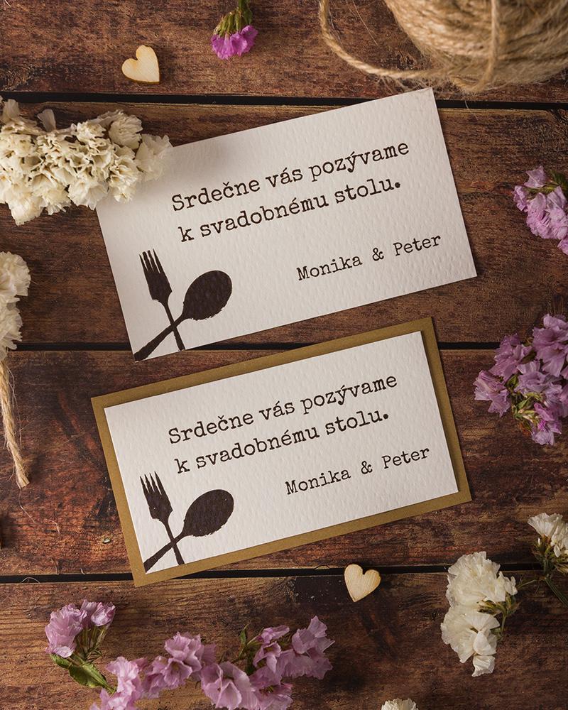 Pre milovníkov vecí z doby minulých, vintage kúskov a jednoduchosti prinášame svadobné oznámenie na mieru! Biele pozadie, dátum a miesto svadby vo vystúpenom štítku a v obklopení juty a čipky a srdiečko v motíve, v ktorom sa spájajú dva odtlačky prstov zaľúbencov, vytvárajú krásny a vkusný celok. V rovnakom motíve Vám vieme vytvoriť i menovky či etikety na fľaše, aby všetko bolo dokonale zladené.