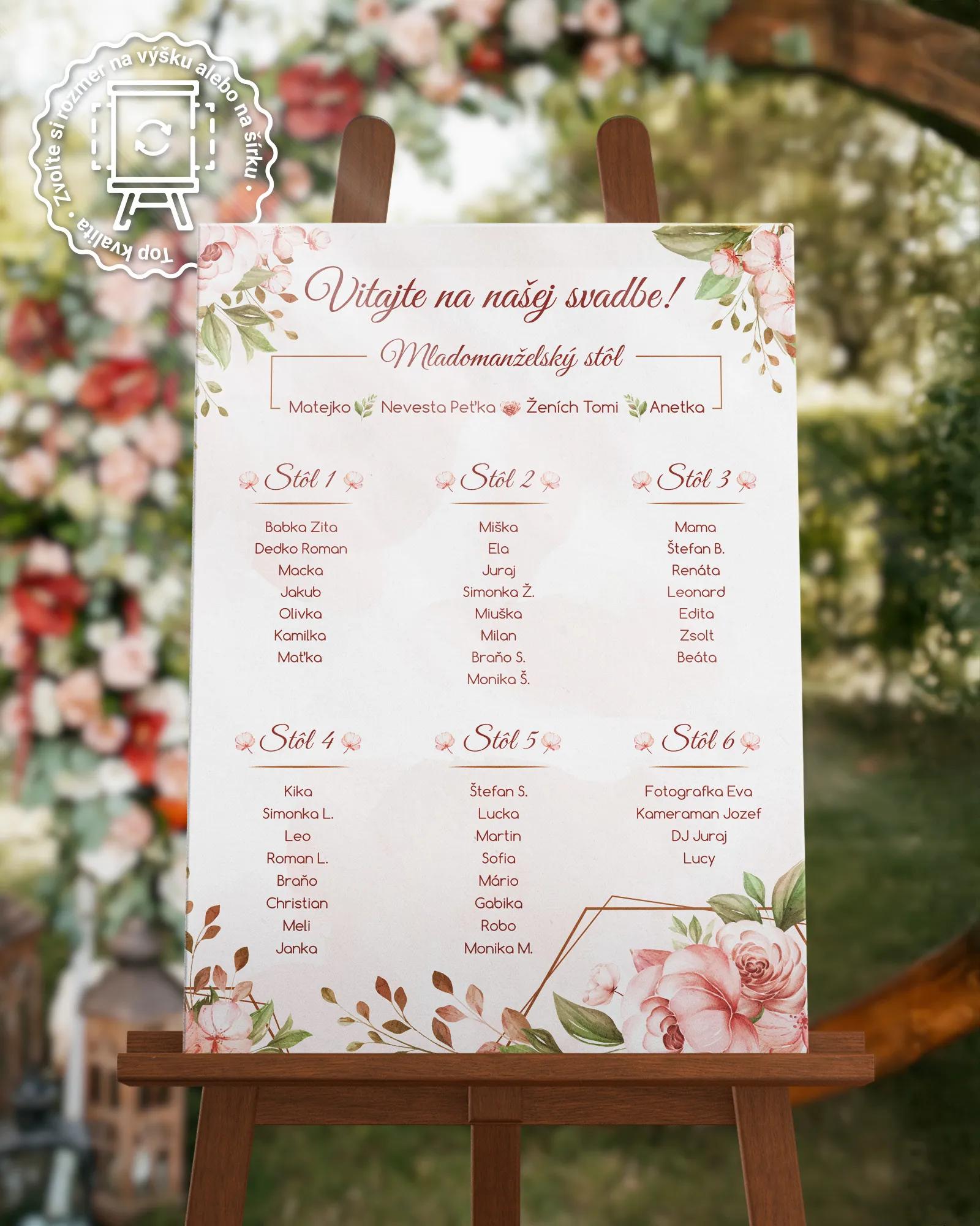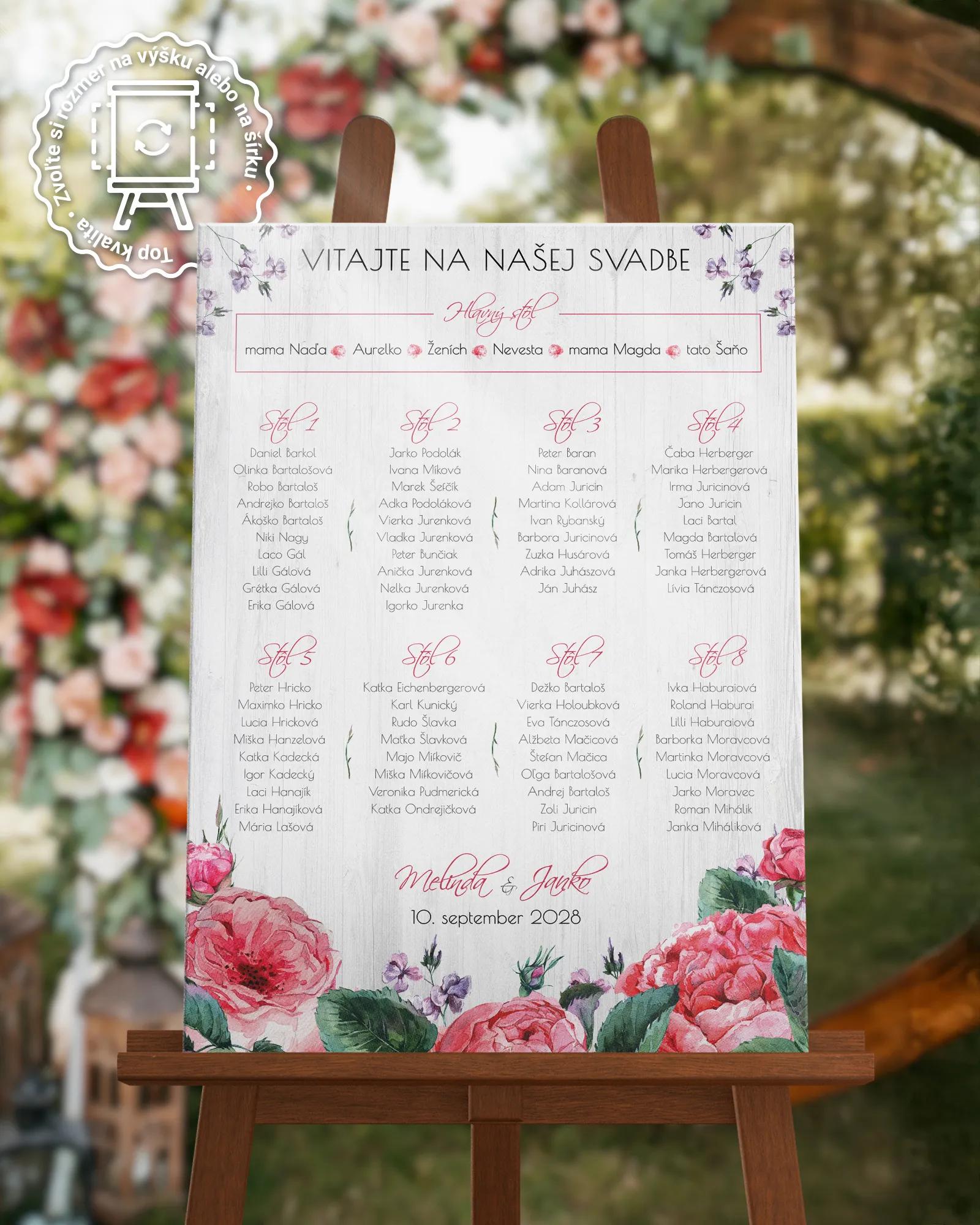 Tlačíme ho na kvalitný fotopapier, pevnú PVC dosku alebo elegantné plátno na drevenom ráme – vždy v dizajne, ktorý dokonale ladí s ostatnými svadobnými tlačovinami v sále (menovky, menu, číslovanie stolov, etikety, uvítacia tabuľa…). Umiestnite ho pri vstupe do miestnosti a vytvorte okamžitý wow efekt, ktorý hostia ocenia ešte predtým, než zasadnú.