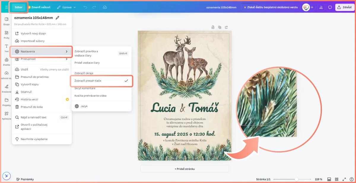 Canva umožňuje jednoduché zobrazenie presahu – nájdete ho v menu pod položkou Súbor – Nastavenia – Zobraziť presah tlače. Pri tvorbe na mobilnom zariadení túto funkciu nájdete na hornej lište pod ikonkou troch bodiek (…) – Zobraziť presah tlače. Následne na vašom návrhu budete vidieť tenkú tmavšiu linku. Všetko smerom dovnútra tejto linky je finálny rozmer tlačoviny. Všetko smerom von od šedej prerušovanej linky je presah – táto časť bude orezaná avšak je potrebná pri tlači. Ako na obrázku vidieť, za šedú linku presahuje nie len samotné pozadie s fotkou ale aj akýkoľvek grafický prvok ktorý má byť umiestnený až po hranu výtlačku. Zároveň však nesmie obsahovať žiaden texty a iné dôležité prvky ktoré by boli po finalizácií odrezané.
