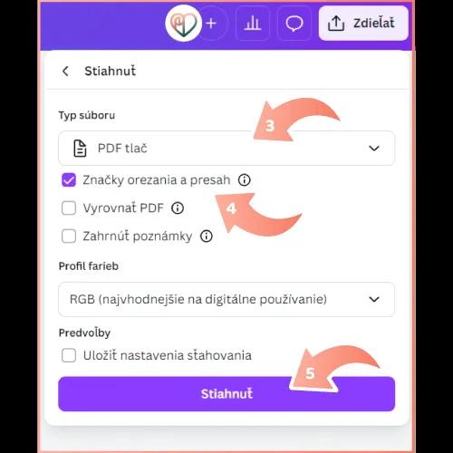 …a zvolíte typu súboru PDF tlač, označíte Značky orezania a presah a už len tlačidlo Stiahnuť.
